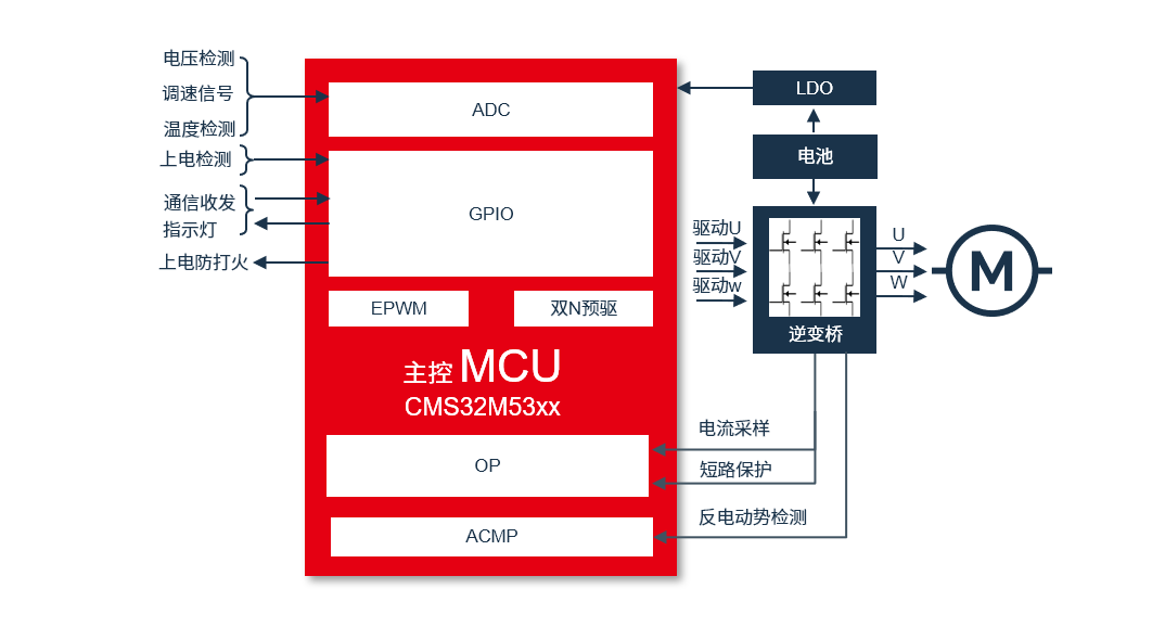 > 内置12位ADC,多路运放,PGA,N+N驱动,精简外围电路